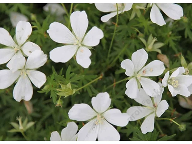 A Geranium sanguineum album / Fehér virágú gólyaorr alacsony növekedésű, fehér virágú, évelő dísznövény. Kompakt, bokros növekedésű növény, általában 20–30 cm magasra nő, és idővel szépen elterül, sűrű növényfoltot alkot.