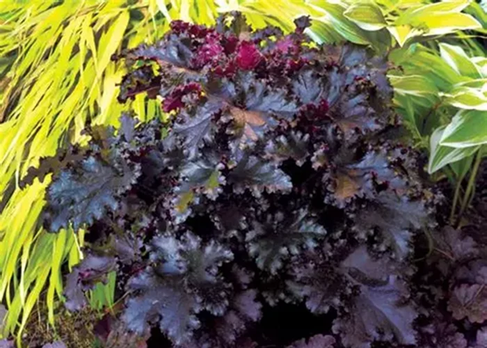 A Heuchera hybrida Black Taffeta / Sötét-bordó tűzeső egy díszleveléért kedvelt évelő növény, amely a Saxifragaceae családba tartozik. Alacsony, bokros növekedésű, általában 20–30 cm magas, virágzattal együtt pedig akár 40–50 cm-re is megnő. Legfeltűnőbb jellemzője a nagyon sötét bordó, majdnem fekete színű, erősen karéjos és enyhén fodros levele, amely különleges kontrasztot ad a kertben más növények mellett.