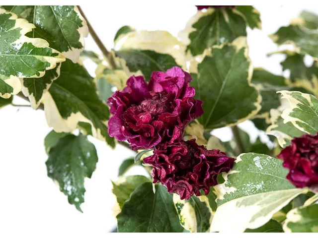 A Hibiscus syriacus ‘Purpureus Variegatus’ egy közepes méretű, lombhullató díszcserje, amely általában 1,5–2,5 méter magasra nő, és lazább, felálló bokrot alkot. Legnagyobb díszítő értéke a különleges, zöld alapon fehéres-krémszínű szegéllyel tarkított lombja, amely már önmagában is feltűnővé teszi a kertben.