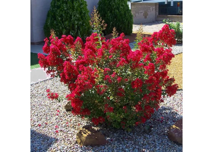 A Lagerstroemia indica Petite Red egy kifejezetten alacsony termetű, sűrű ágrendszerű kínai selyemmirtusz, amelynek apró, fényes levélzete tavasszal vöröses árnyalatban hajt ki, nyáron sötétzöldre vált, ősszel pedig látványos narancsvörös színt ölt. A növény legfőbb ékessége a lángvörös, krepp-papírhoz hasonlóan fodros virágzata, amely sűrű bugákban nyílik a hajtások végén. Ez a bőséges virágzási idő júliustól egészen a szeptemberi fagyokig tart, hosszan tartó színfoltot biztosítva a kertben vagy a teraszon.