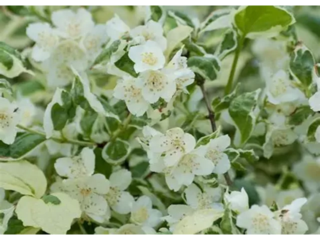 A növény legnagyobb díszértéke nyár elején, május–júniusban virágzik, amikor bőségesen hozza a közepes méretű, fehér, tölcséres virágokat, amelyek erősen, édesen illatoznak, emlékeztetve a narancsvirág illatára. Virágai a hajtások végén jelennek meg, így tömegesen, látványosan borítják a bokrot.