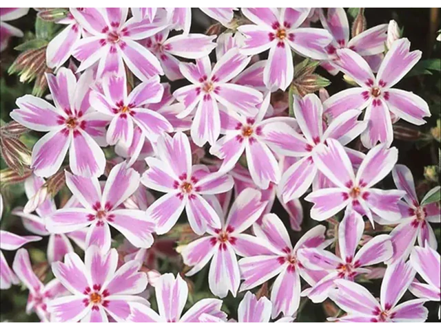 A Phlox subulata kimono pink white /Árlevelű lángvirág tarka egy alacsony növésű, talajtakaró évelő növény, amely a phloxok családjába tartozik. A növény sűrű, tűszerű, örökzöld levelekkel rendelkezik, amelyek tavasztól őszig megőrzik zöld színüket, így egész évben dekoratív alapot biztosít a kertben.