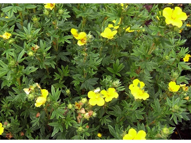 Levelei aprók, szárnyaltak, többnyire 3–5 keskeny levélkéből állnak, színük szürkészöld vagy középzöld. A növény fő díszítőértékét a hosszan tartó virágzása adja. Virágai élénk sárga színűek, egyszerű felépítésűek, öt sziromból állnak. A virágzás nagyon hosszú ideig tart, általában májustól egészen szeptember–októberig folyamatosan hozza virágait.